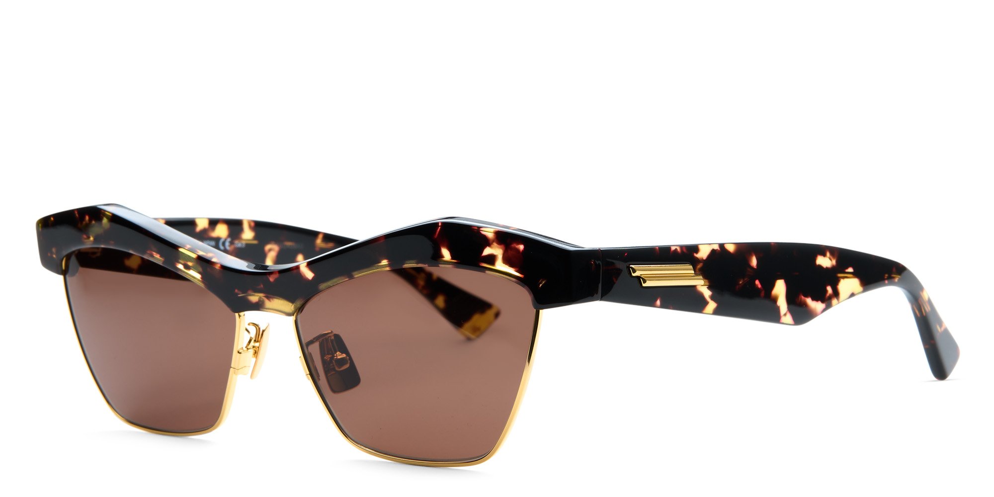 The BV1099S sunglasses by Bottega Veneta are elegantly designed in a distinctive style made popular in the 50s. Full rim frames are designed in the classic clubmaster style with a cat eye hint for vintage appeal. Browline and temples are crafted from lightweight yet durable acetate. Rims are made from strong, corrosion resistant metal. Rivet detailing adorns the temples. If youre looking to make a personal statement with your style, reach for these BV1099S sunglasses from Bottega Veneta.