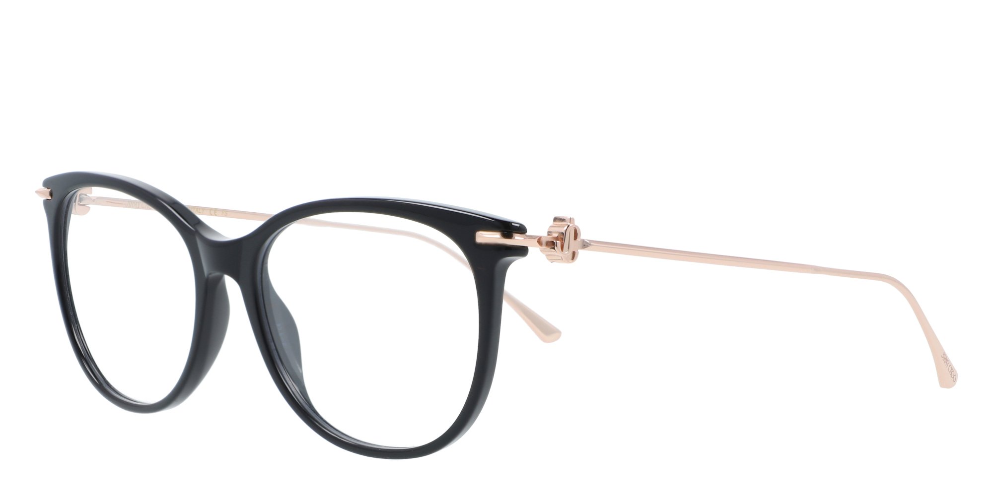 The JC Logo eyewear collection showcases the new Jimmy Choo monogram, as seen on this season's Ready-to-Wear & Accessories. The letters J and C intertwine in a sculptural, multifaceted design, becoming a signature jewel detail on the brand's optical glasses. Elegant and minimal, the JC263 optical frames feature a round havana front and thin, geometric rose gold tone metal temples. The Jimmy Choo initials add a precious twist.