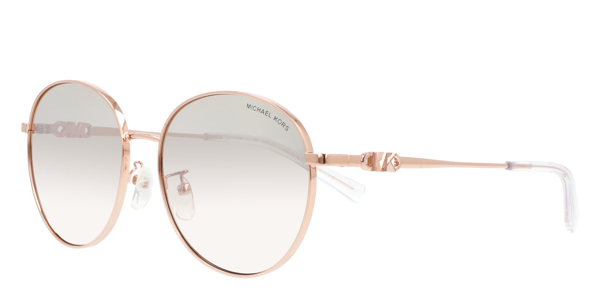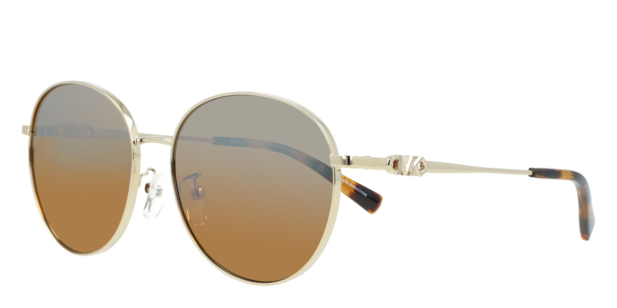 The MK1119 sunglasses from Michael Kors are a bold, timeless design. The round frames are made in lightweight, corrosion resistant metal that retains its shape. The slim temples curve inward softly for stability behind the ears and boast a sleek silhouette. With their distinctive center hook detail at the brow end, these sunglasses exude urban chic.