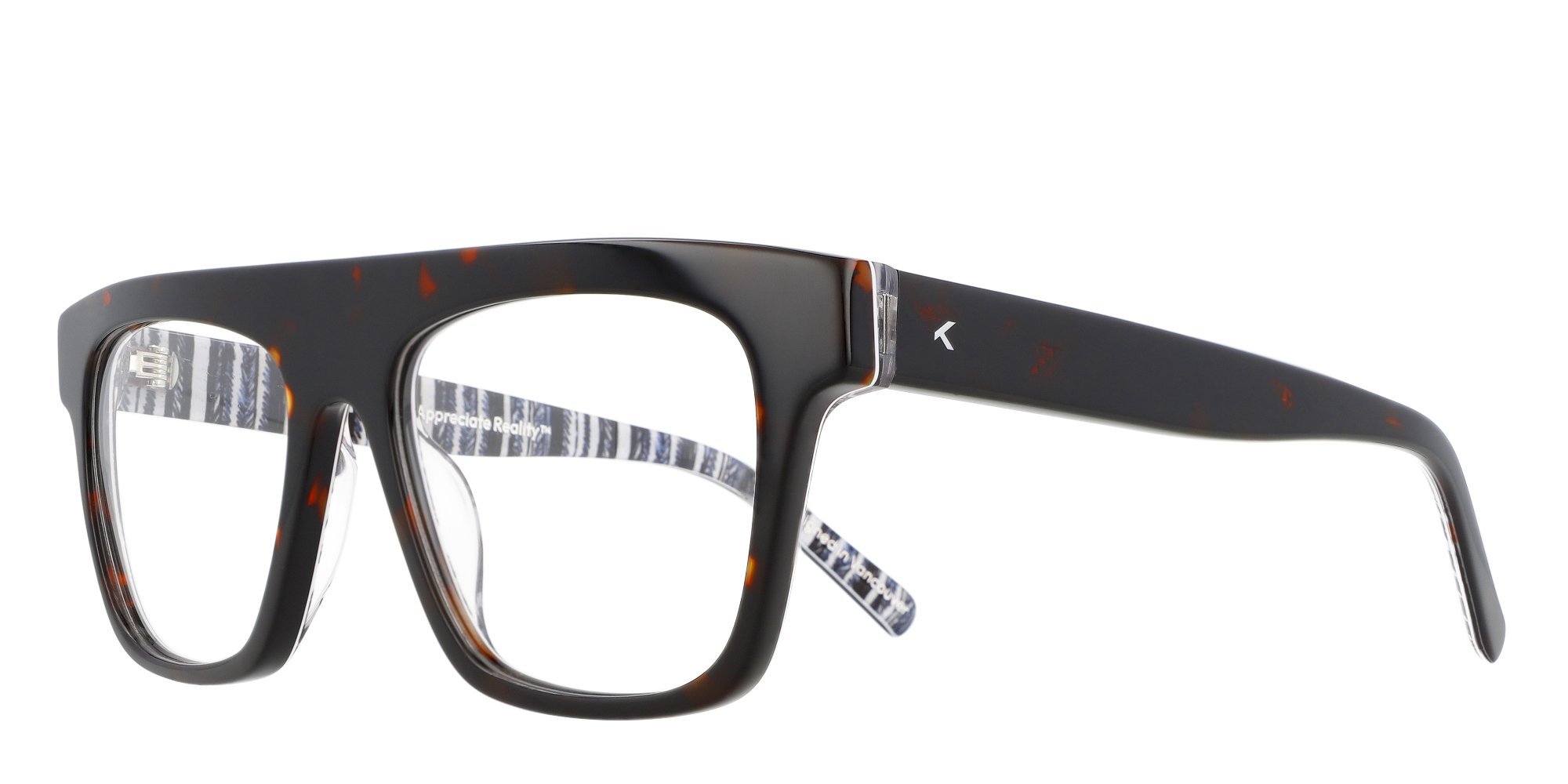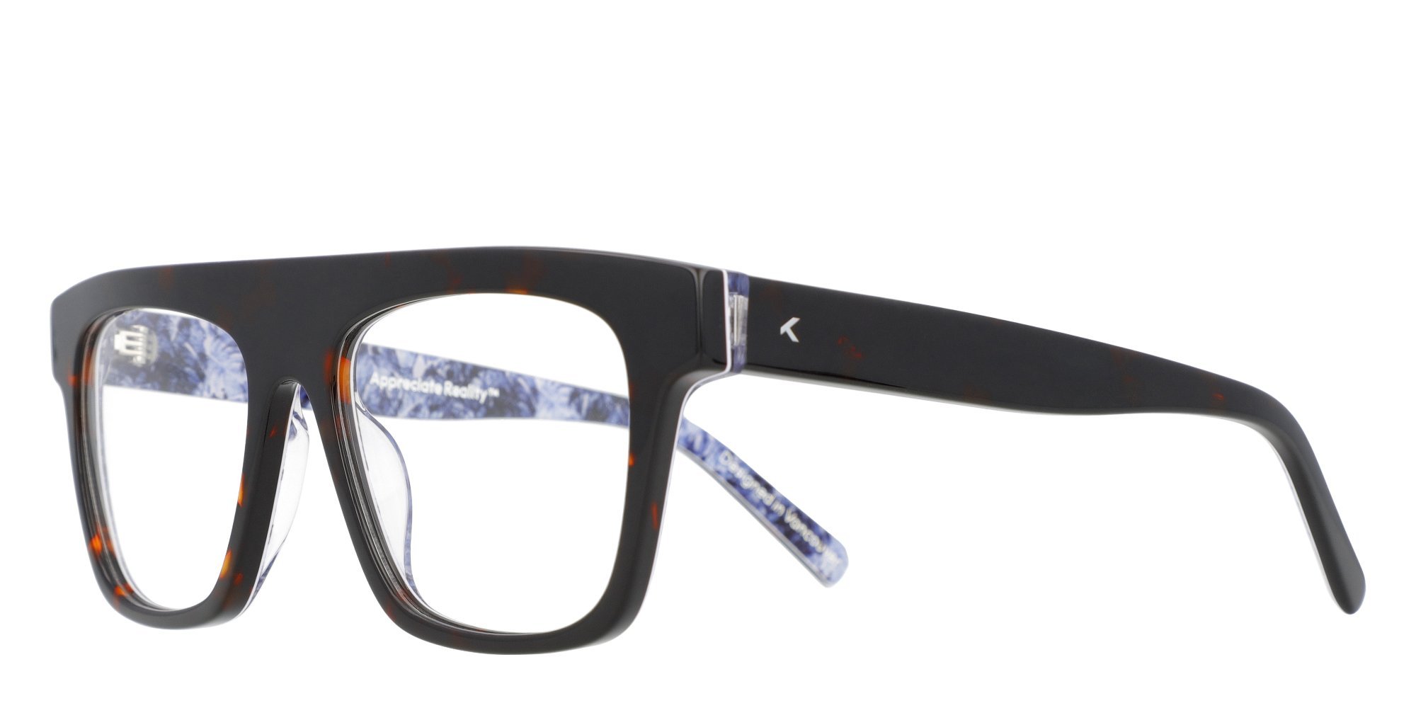 - Made from custom layered acetate with denim blue and white inside prints