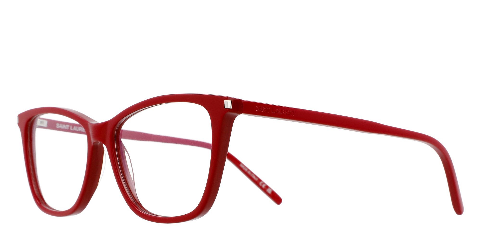 For a bold and feminine look, the Saint Laurent SL 259 Optical frames feature a striking cat-eye design made from premium acetate. These full-rim glasses offer both style and comfort, making them perfect for daily wear. The iconic Saint Laurent logo on the temples adds a luxurious detail to this chic accessory.