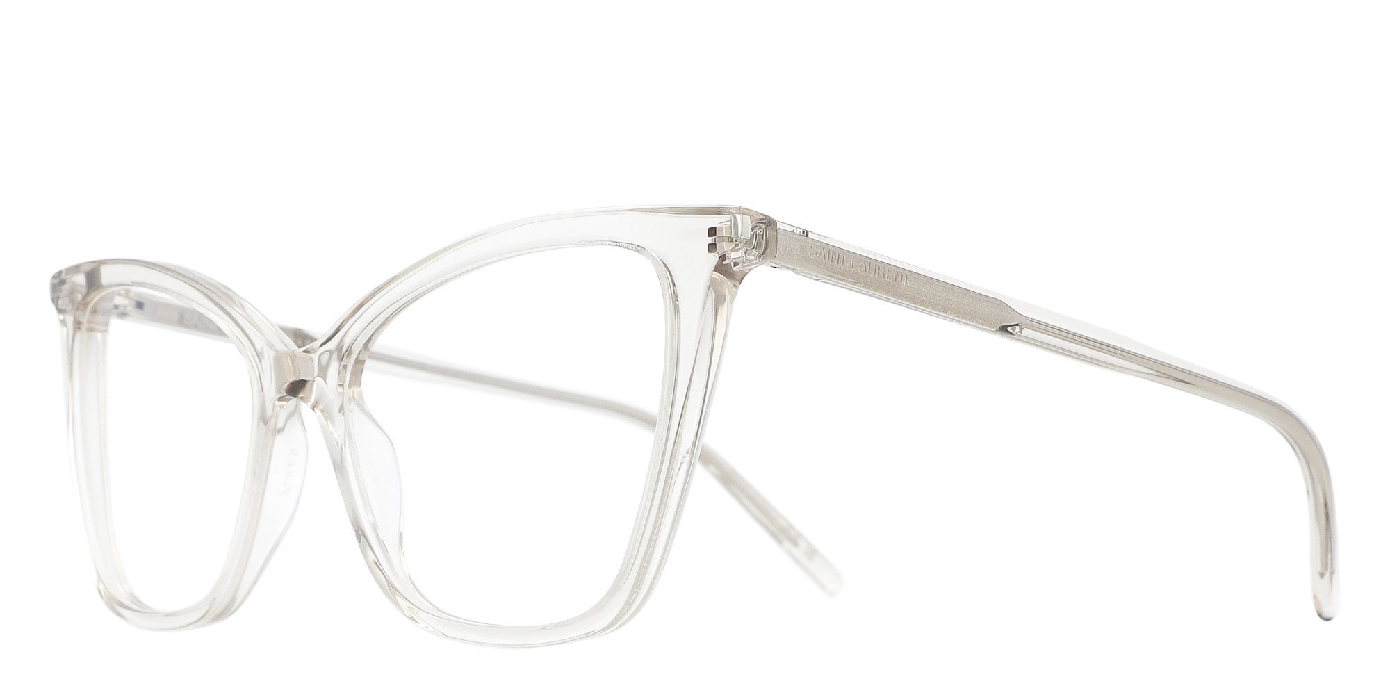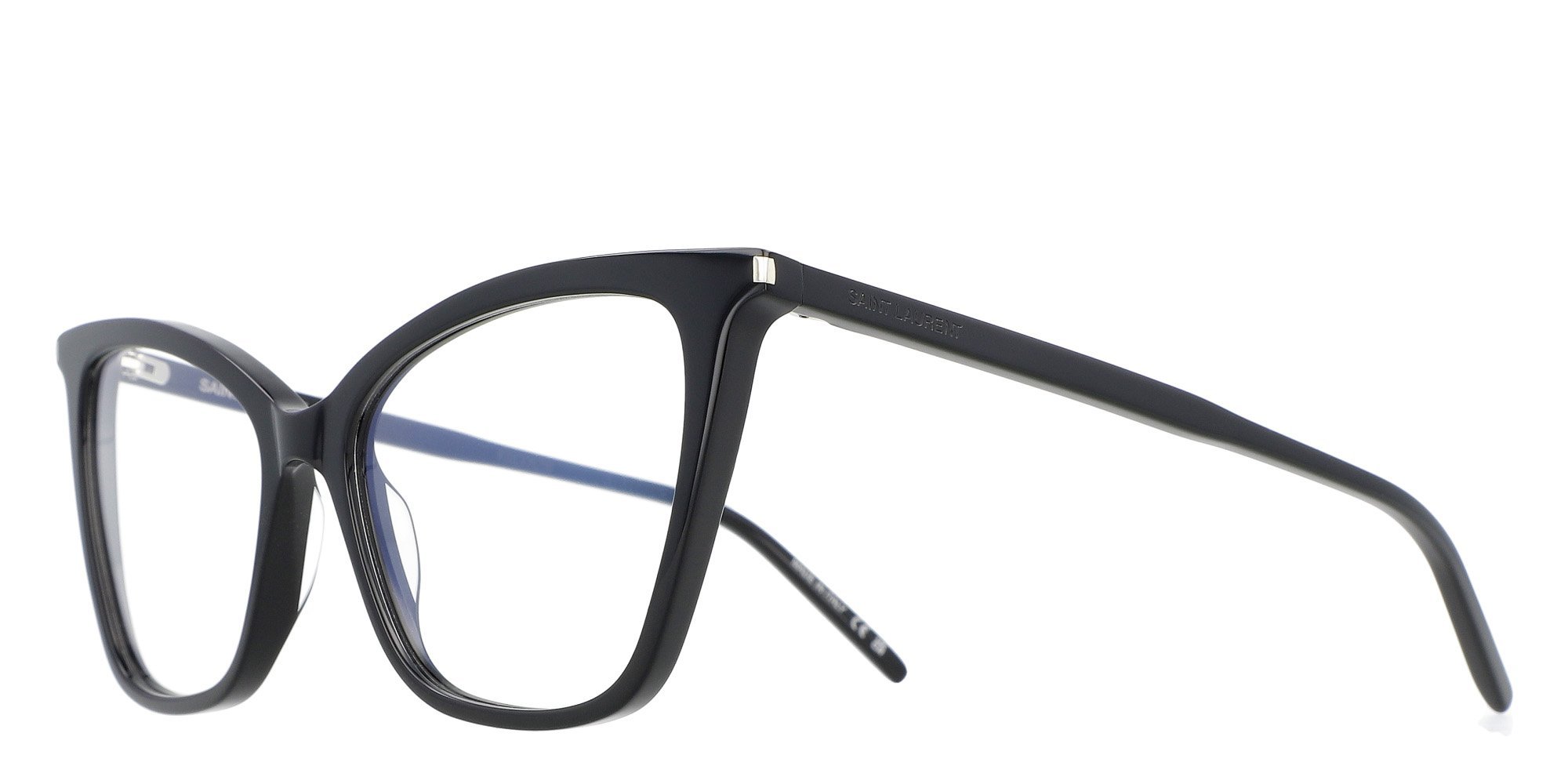 The Saint Laurent SL 386 Optical frames feature a striking cat-eye silhouette crafted from premium acetate. These full-rim glasses offer a bold and sophisticated look, making them perfect for those who want to make a statement. The iconic Saint Laurent logo on the temples adds a touch of luxury to this fashionable design.