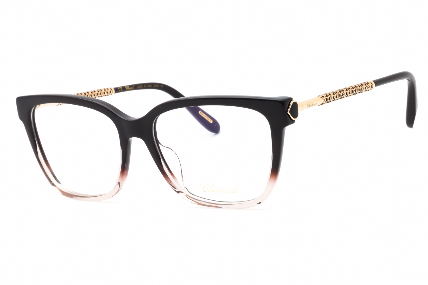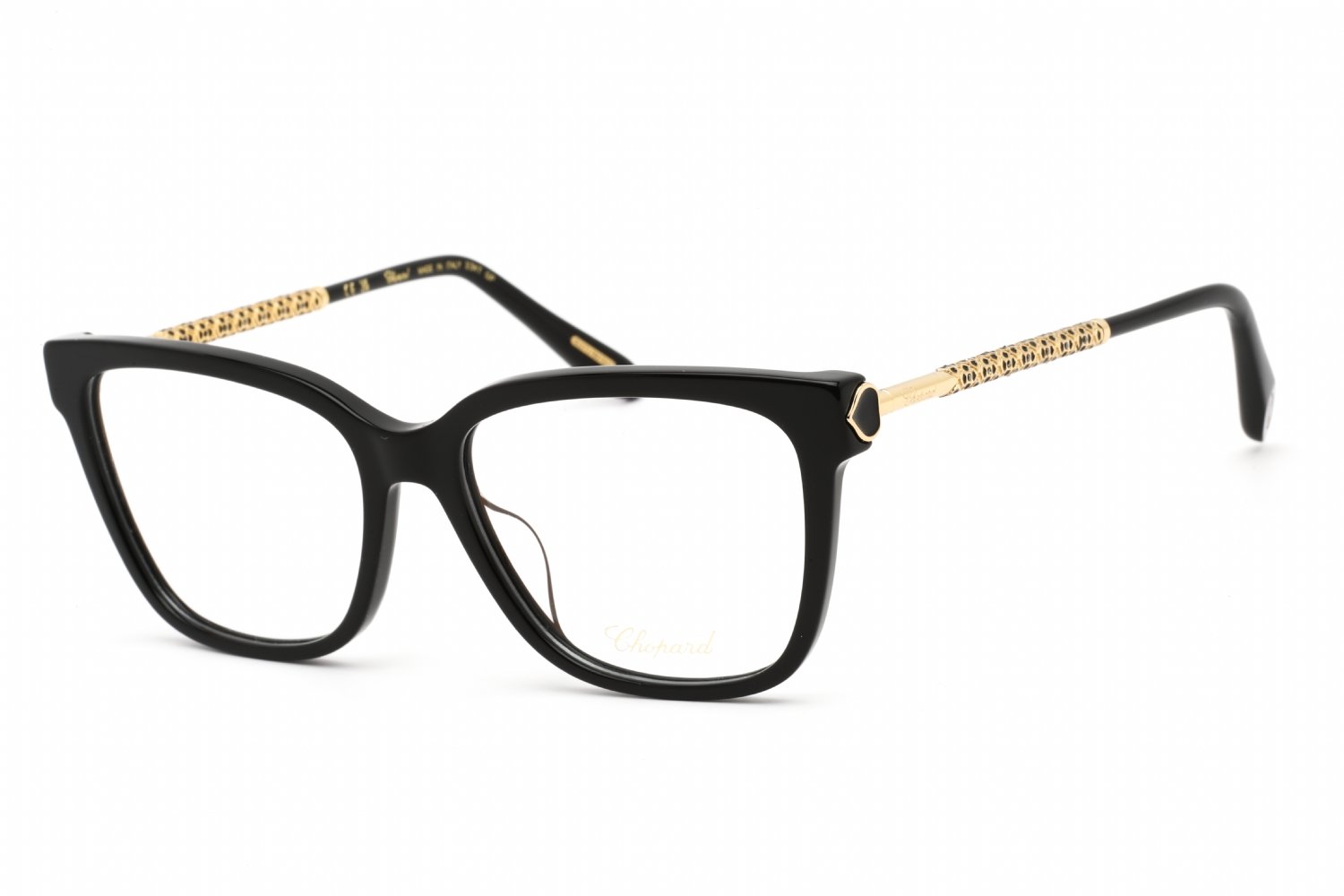 Chopard VCH333W in Shiny Black. This model features an eye catching shape to complement your facial features.The frame is made from quality materials, balancing weight and strength for your ultimate comfort.